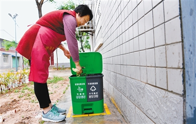 雖然下著雨,但何村社區(qū)滿(mǎn)眼綠樹(shù)紅花、處處干凈整潔。村民崔玉玲在自己家中,系著印有“垃圾分類(lèi) 從我做起”的圍裙,從冰箱取出蔬菜,擇洗完畢后,熟練地拿著要丟棄的菜葉子,扔進(jìn)了家門(mén)口大垃圾桶里標(biāo)著“可腐爛”字樣的綠色小桶里。