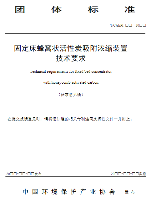 各有關(guān)單位: 為促進(jìn)固定床蜂窩狀活性炭吸附技術(shù)發(fā)展,規(guī)范固定床蜂窩狀活性炭吸附濃縮裝置的制造使用,我會下達(dá)編制中國環(huán)境保護(hù)產(chǎn)業(yè)協(xié)會標(biāo)準(zhǔn)《固定床蜂窩狀活性炭吸附濃縮裝置技術(shù)要求》。目前,標(biāo)準(zhǔn)編制單位已完成標(biāo)準(zhǔn)的征求意見稿。根據(jù)《中國環(huán)境保護(hù)產(chǎn)業(yè)協(xié)會標(biāo)準(zhǔn)管理辦法》的規(guī)定,現(xiàn)將該標(biāo)準(zhǔn)征求意見稿和有關(guān)材料印...