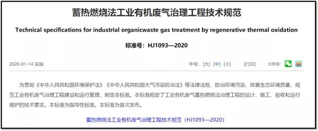 2020年1月14日,生態(tài)環(huán)境部發(fā)布了一個重磅的行業(yè)技術(shù)規(guī)范,即批準《蓄熱燃燒法工業(yè)有機廢氣治理工程技術(shù)規(guī)范》為國家環(huán)境保護標準,并予發(fā)布,標準編號為HJ1093-2020。 該標準與《揮發(fā)性有機物污染防治技術(shù)政策》、《吸附法工業(yè)有機廢氣治理工程技術(shù)規(guī)范》、《催化燃燒法工業(yè)有機廢氣治理工程技術(shù)規(guī)范》...