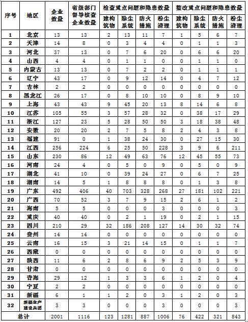 國(guó)家安監(jiān)總局辦公廳近日發(fā)布《關(guān)于2017年工貿(mào)行業(yè)專項(xiàng)整治工作進(jìn)展情況的通報(bào)》?!锻▓?bào)》指出,2017年,全國(guó)工貿(mào)行業(yè)企業(yè)沒(méi)有發(fā)生較大及以上事故。對(duì)存在各類隱患的粉塵涉爆企業(yè),限期整改18087家、停產(chǎn)整頓3380家、取締關(guān)閉3601家、執(zhí)法處罰3504萬(wàn)元。《通報(bào)》指出,截至2017年底,各地區(qū)共...